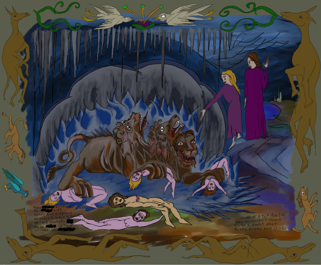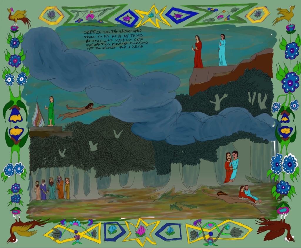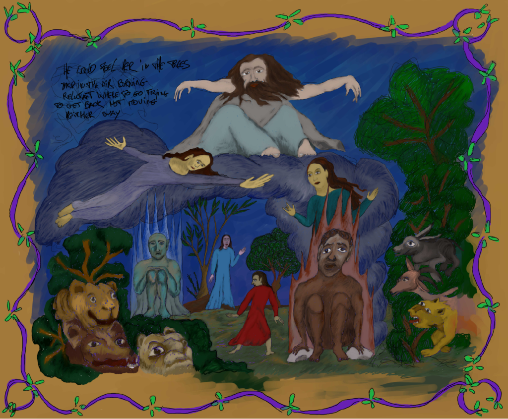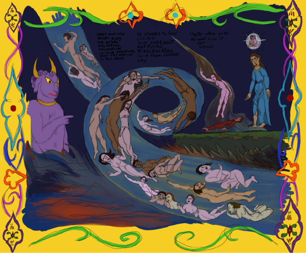 "Feng Ciao" is a conceptual project that reinterprets William Blake's illustrations of Dante's Divine Comedy through the lens of a mid-life crisis. By writing the predominant thoughts directly onto the images I create from these reinterpretations, I add a new layer of meaning to the artwork, creating a dialogue between the images and personal reflections on life's existential turning points. These reflections emerge from the emotional and existential considerations that the reinterpretations provoke, engaging with themes of transformation and self-reflection in the context of a mid-life crisis.