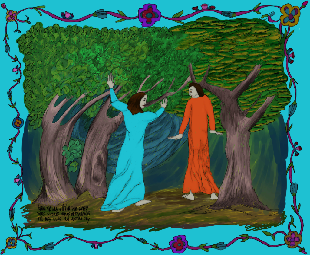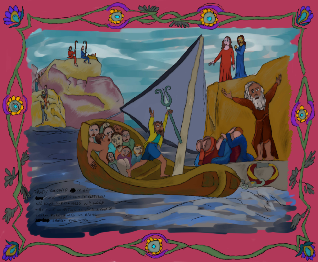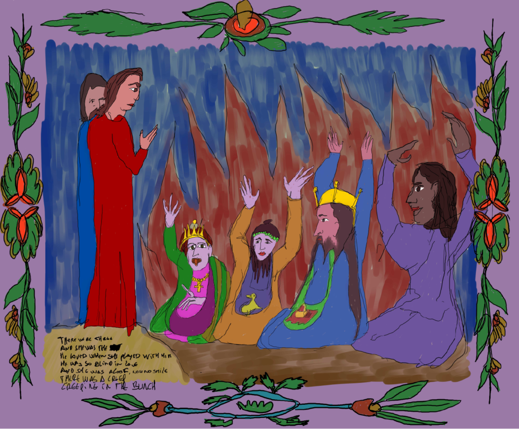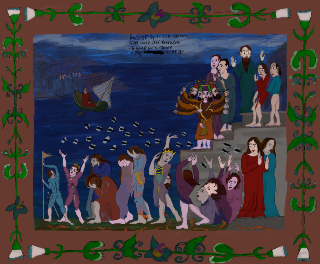 "Feng Ciao" is a conceptual project that reinterprets William Blake's illustrations of Dante's Divine Comedy through the lens of a mid-life crisis. By writing the predominant thoughts directly onto the images I create from these reinterpretations, I add a new layer of meaning to the artwork, creating a dialogue between the images and personal reflections on life's existential turning points. These reflections emerge from the emotional and existential considerations that the reinterpretations provoke, engaging with themes of transformation and self-reflection in the context of a mid-life crisis.