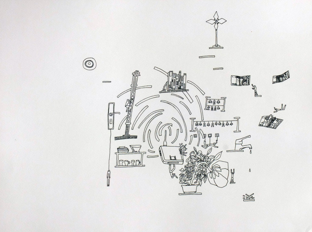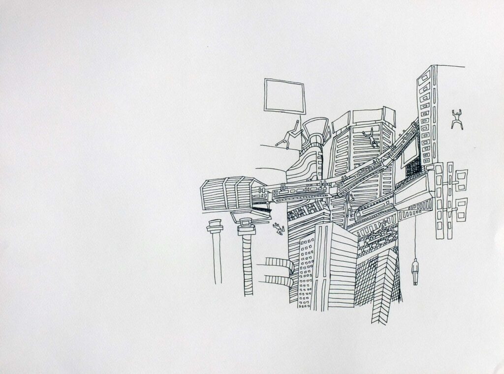 Esta série de desenhos forma a base de uma linguagem gráfica pessoal, que mistura elementos de parkour, os primeiros videojogos, vertigem e a interconexão de todas as coisas. A obra explora o movimento dinâmico e a navegação espacial, onde gestos fluidos e acrobáticos refletem a precisão e a desorientação encontradas nas paisagens dos videojogos e na experiência de vertigem. Cada desenho captura um momento de tensão e libertação, refletindo as complexas interações entre o movimento físico, os mundos digitais e a perceção da realidade. Através desta obra, o artista reflete sobre como esses elementos—movimento, tecnologia e a sensação de vertigem—estão entrelaçados, criando uma linguagem visual única que fala da fluidez e complexidade da existência.