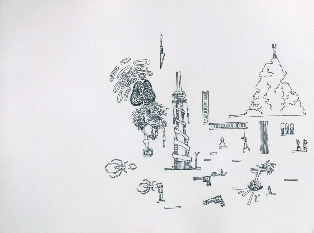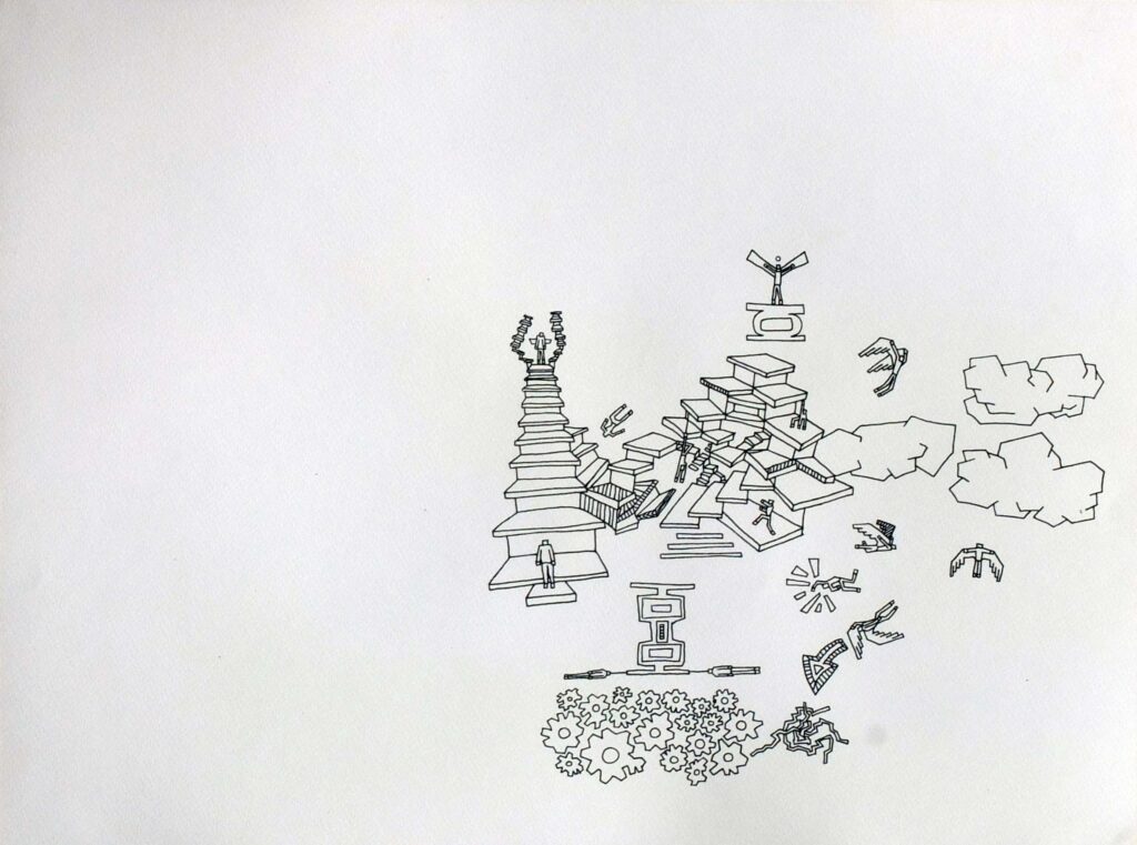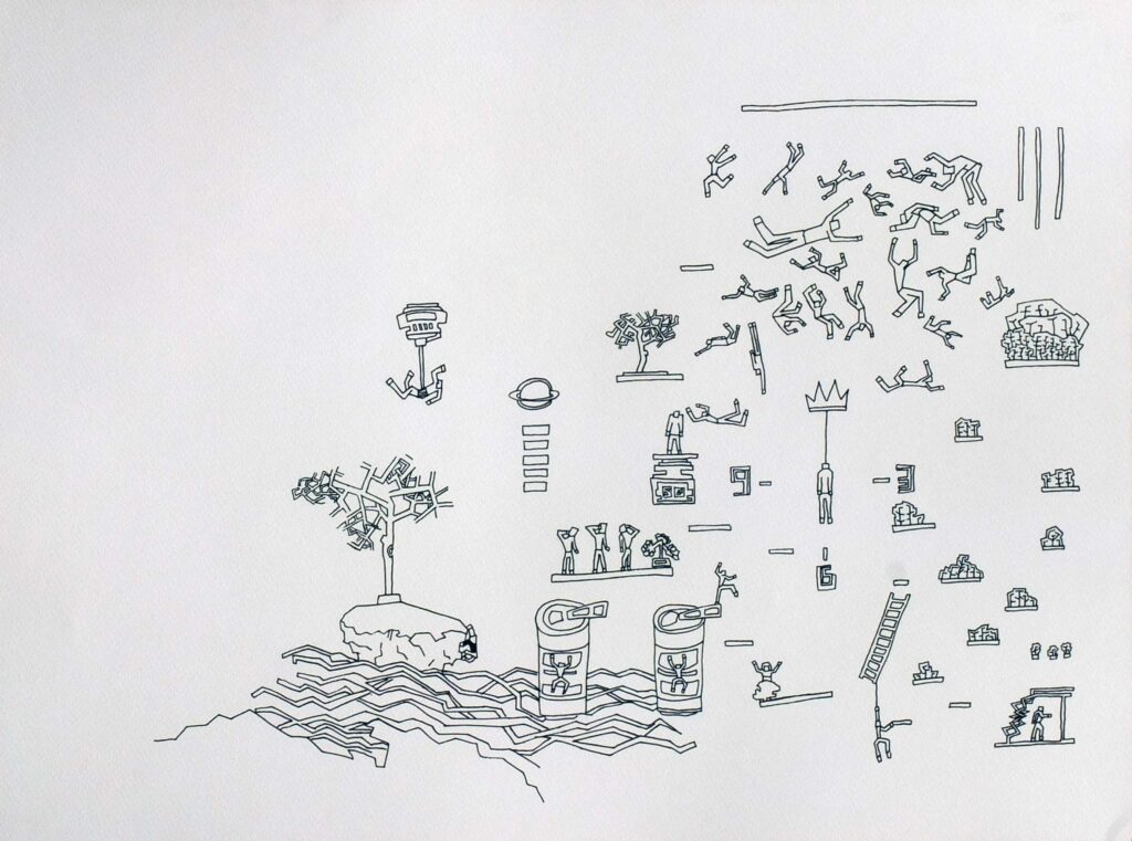 This series of drawings forms the foundation of a personal graphic language, blending elements of parkour, early video games, vertigo, and the interconnectedness of all things. The artwork explores dynamic movement and spatial navigation, where fluid, acrobatic gestures mirror the precision and disorientation found in video game landscapes and the experience of vertigo. Each drawing captures a moment of tension and release, reflecting the complex interrelations between physical movement, digital worlds, and the perception of reality. Through this work, the artist reflects on how these elements—movement, technology, and the sensation of vertigo—are intertwined, creating a unique visual language that speaks to the fluidity and complexity of existence.