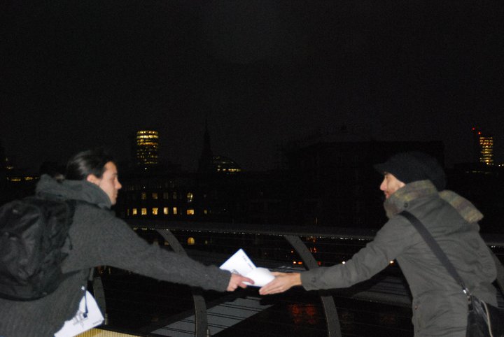 Esta performance envolve o público numa ação participativa de distribuição de panfletos, desfocando as linhas entre o performer e o espectador. Através desta ação partilhada, a obra explora temas como a comunicação, a disseminação de informações e o poder do engajamento coletivo. À medida que os panfletos são distribuídos, a performance convida à reflexão sobre o impacto da informação em massa, o papel do indivíduo na propagação de mensagens e o ato de participar como uma forma de expressão. Trata-se de uma troca dinâmica que questiona a forma como a informação é consumida e partilhada na sociedade contemporânea.